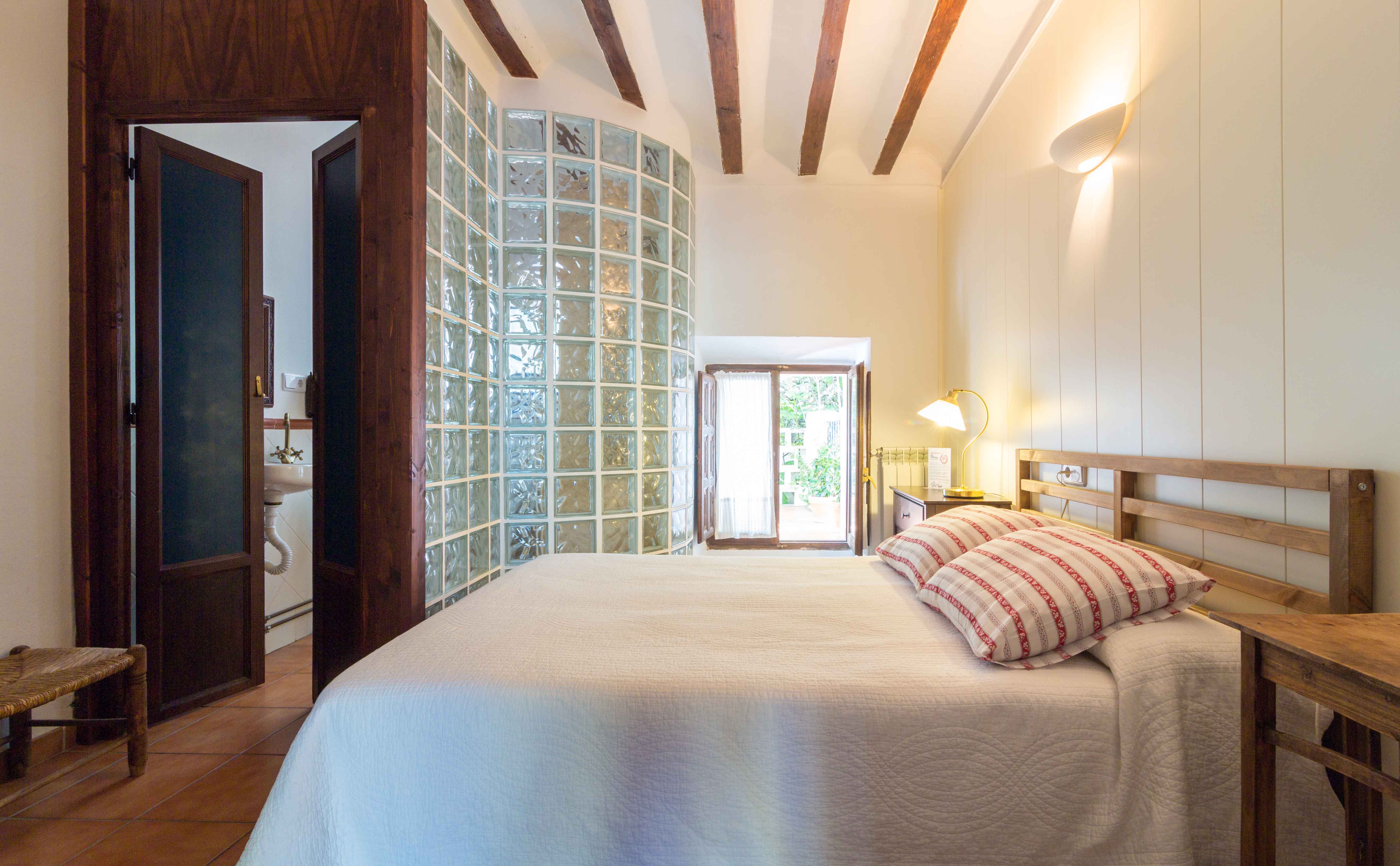 Habitación con cama de matrimonio, coqueta, sin grandes dimensiones pero muy agradable, luminosa y ligera, con acceso a una pequeña terraza separada del baño con un muro de ladrillo transparente que da un toque especial y diferente a la estancia.